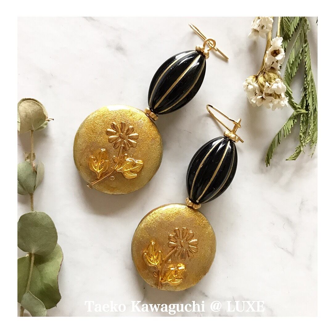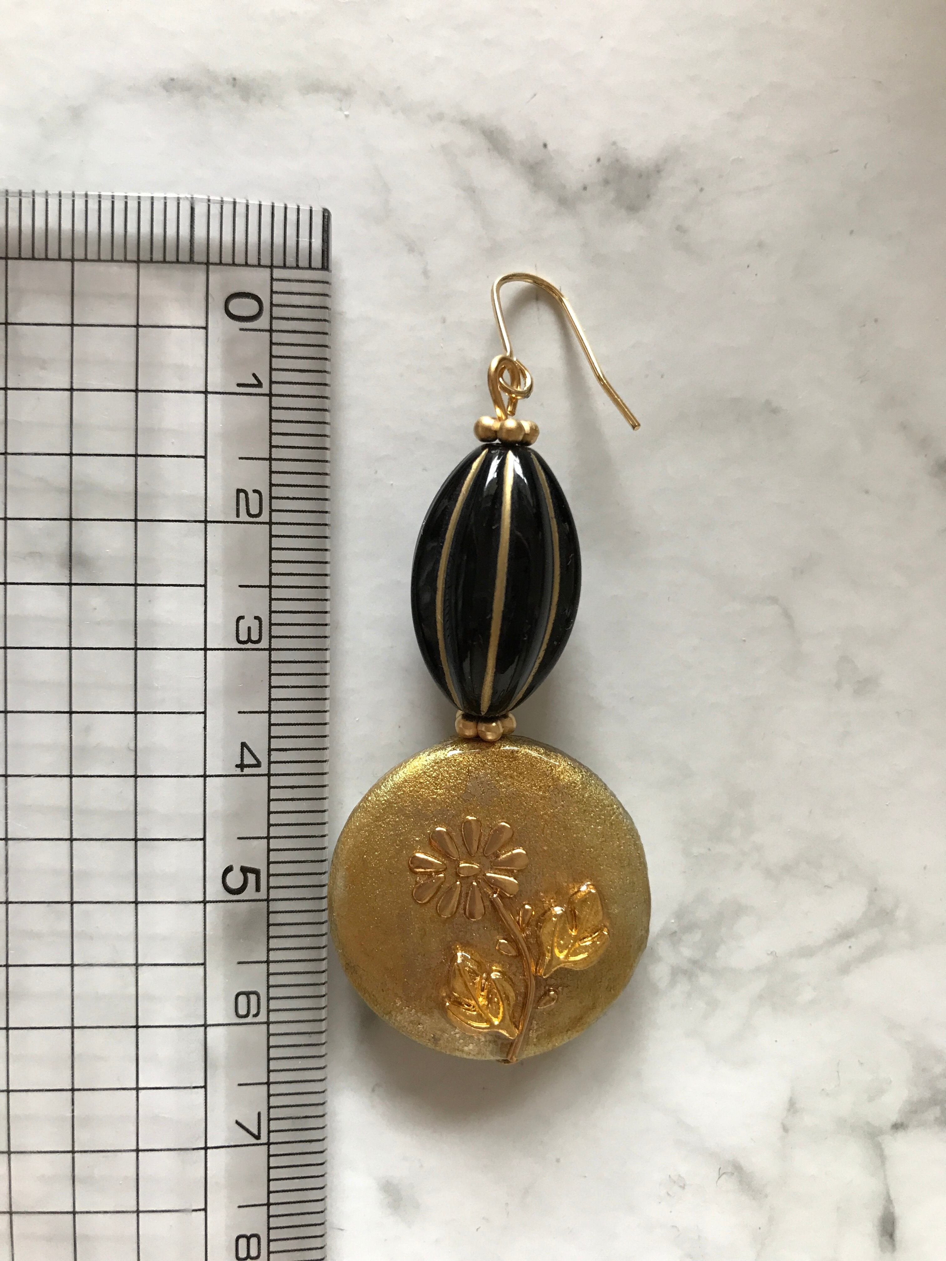 ゴールドにペイントしたウッドパーツに、メタリックパーツで一つ一つ作ったボタニカル柄。そしてブラックのストライプパーツで、ヴィンテージジュエリーのような重厚感のある、完全オリジナルデザインピアスです。