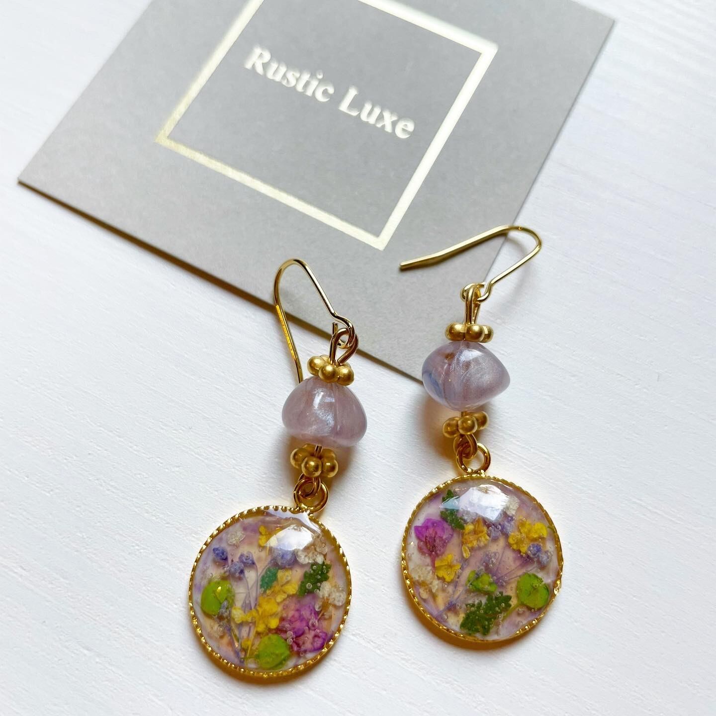 リアルドライフラワーを散りばめてレジンで埋め込んだアートです。