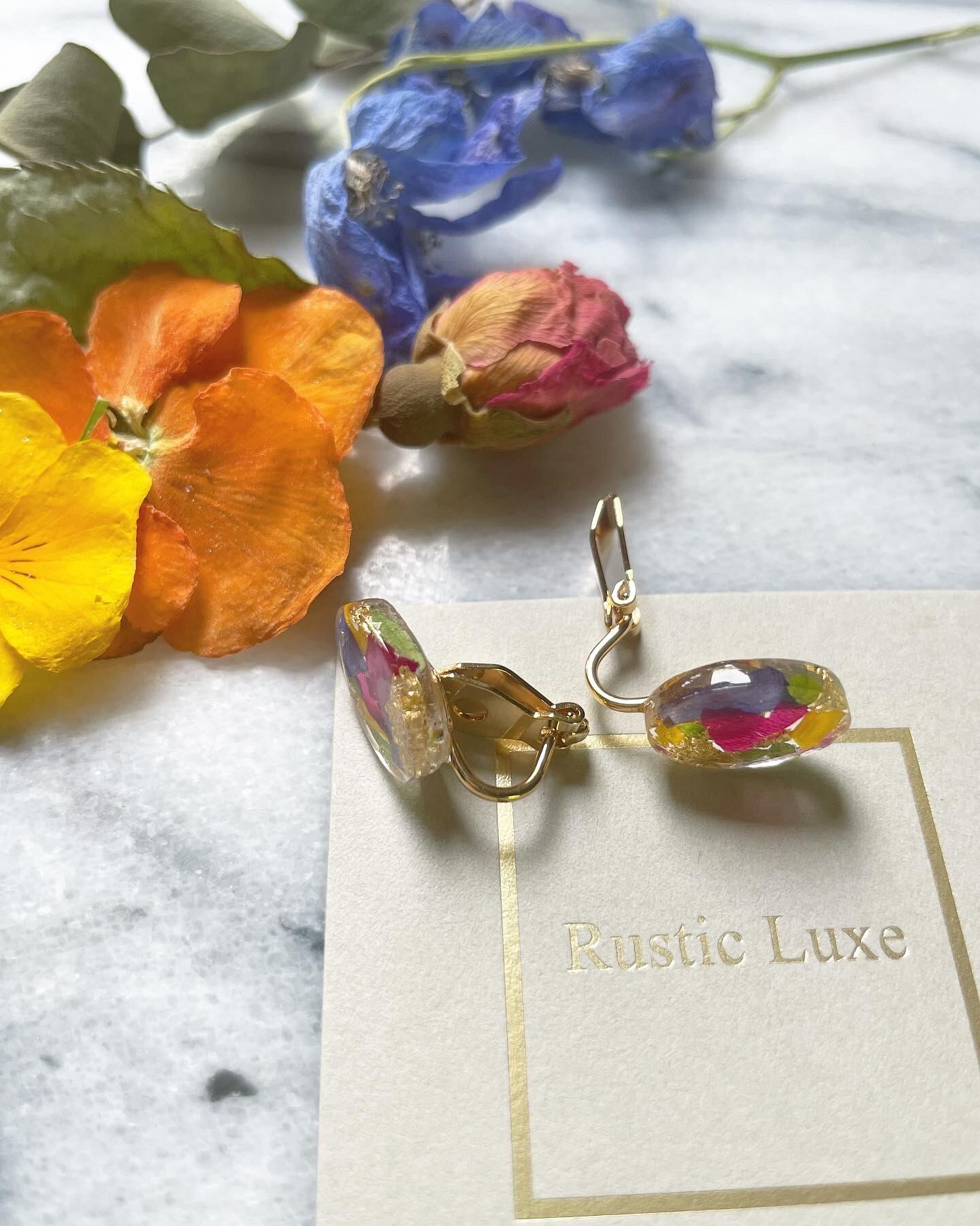 バラ、ビオラ、ガーベラの花びらをドライフラワーにしたものをレジンに埋め込みました。