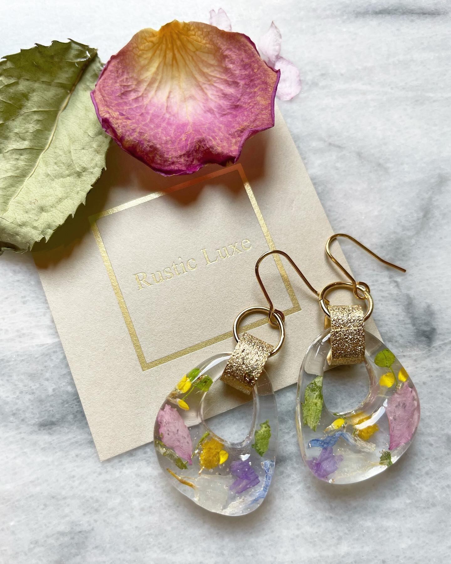 桜の花びらや、ブルーのデルフィニウム、スターチスなどの優しい色合いのドライフラワーをレジンに埋め込みました。