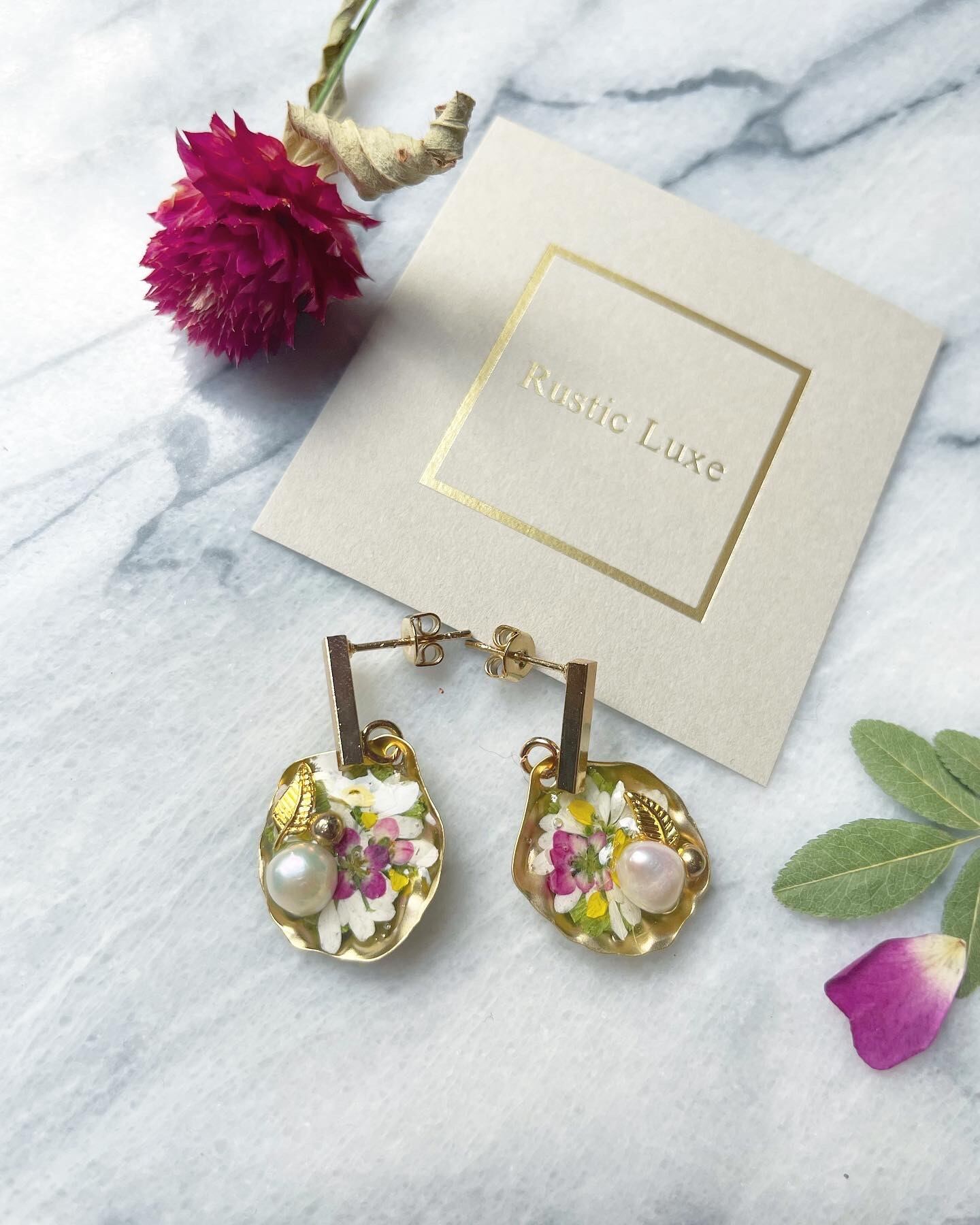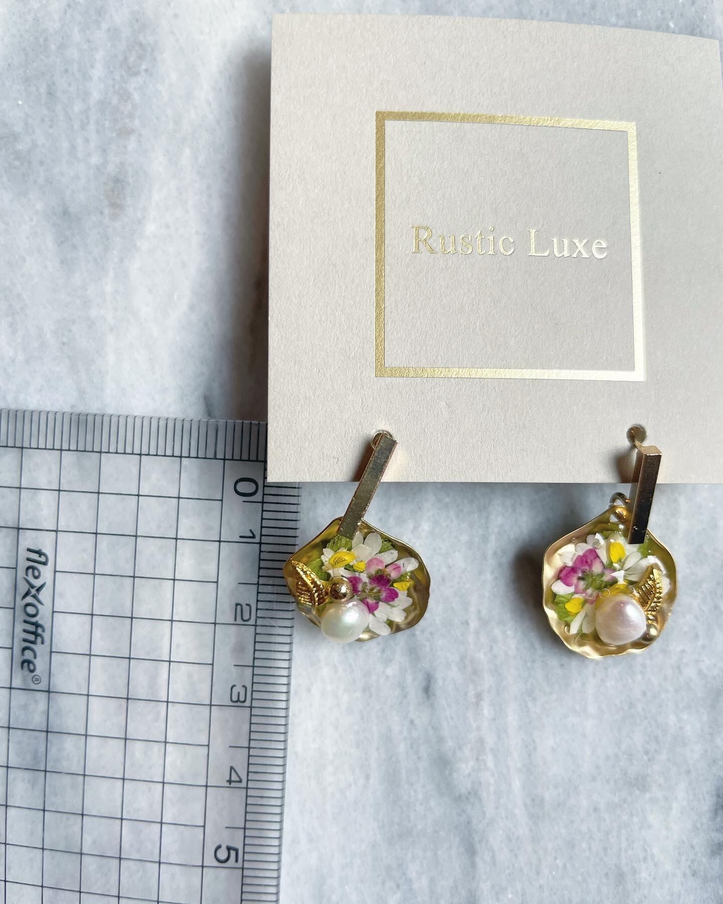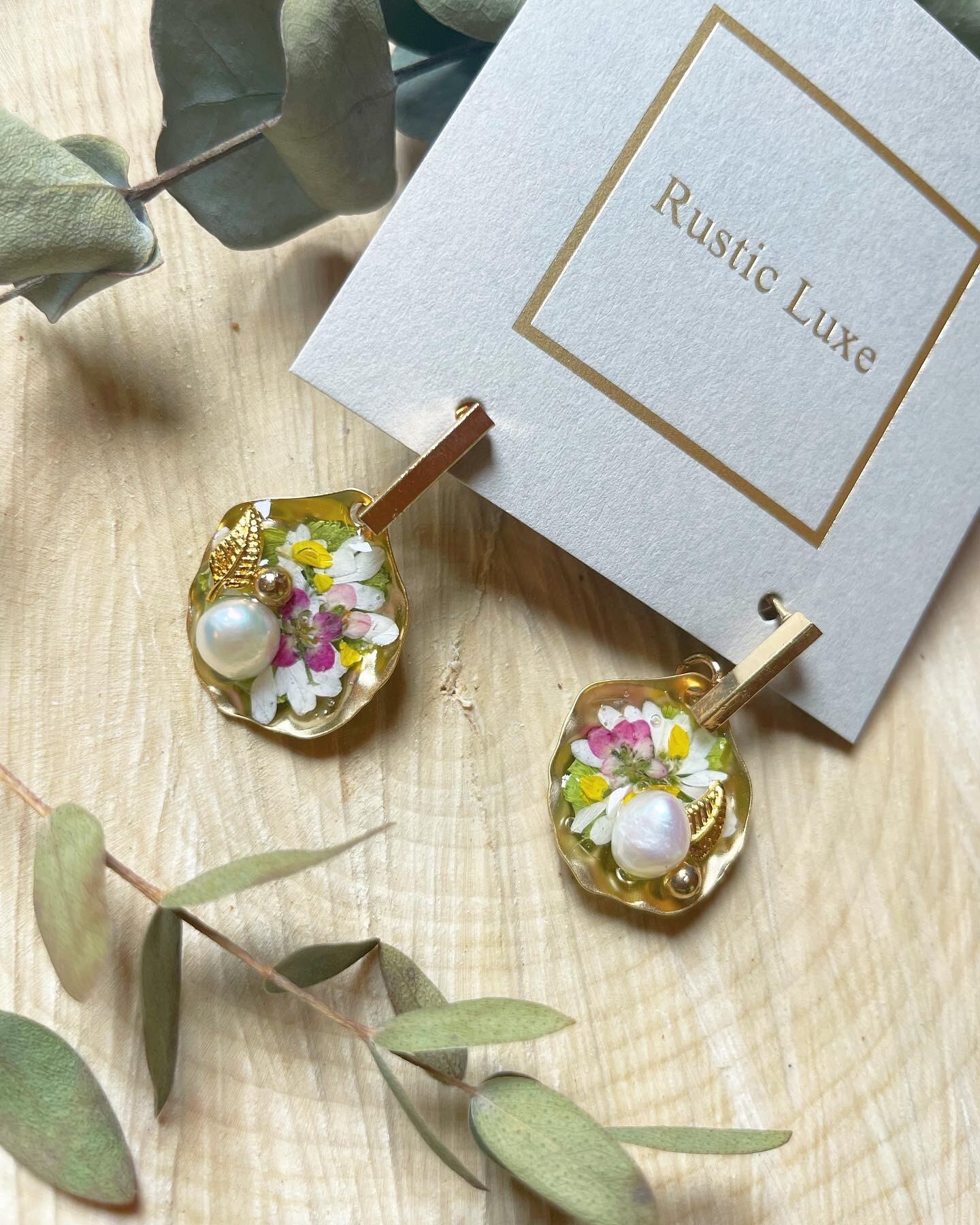 花びら型のメタルパーツの上に、アリッサム、ユーフォルビアのドライフラワーを乗せて、淡水パールとゴールドパーツで飾りました♡