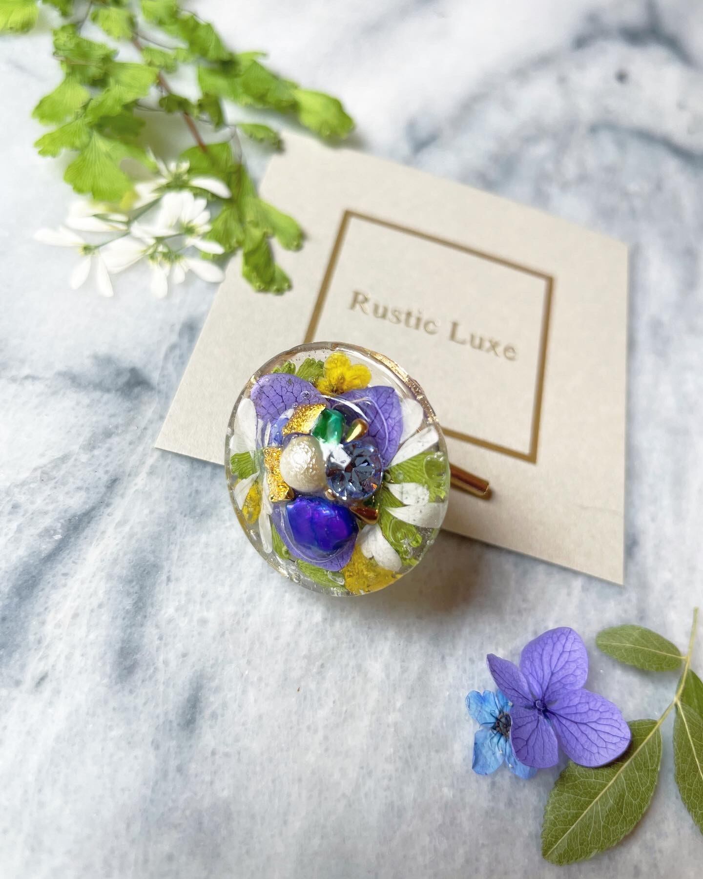 紫陽花、アリッサム、ユーフォルビアのドライフラワーを埋め込んだ上に、スワロフスキーやパール、シェルなどで飾ったポニーフックです♡