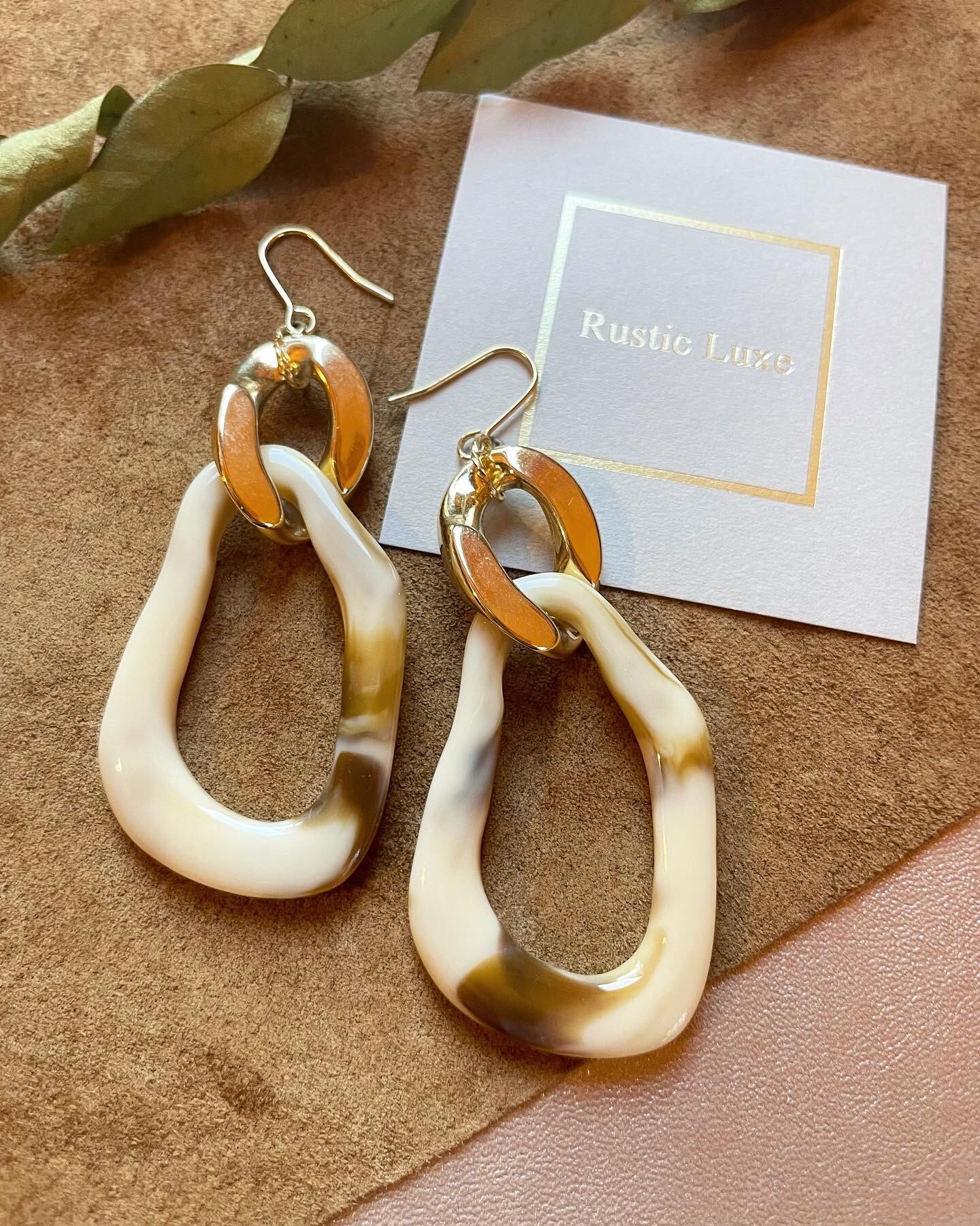 ベージュのマーブル、べっこうのような大ぶりなフープが揺れるピアスです。