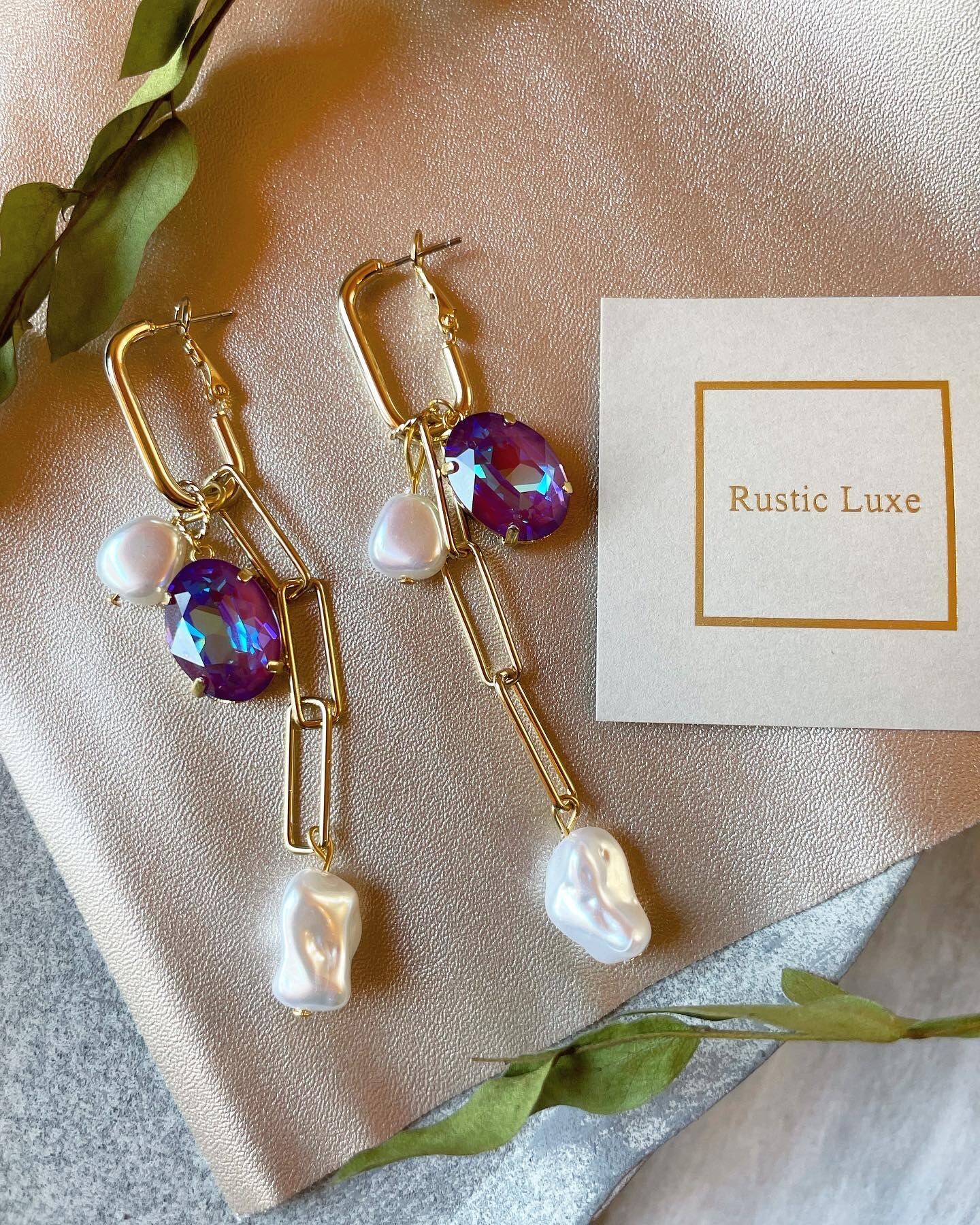 大ぶりな赤みの強いパープルのスワロフスキーにチェーン、バロックパールを合わせた存在感ばっちりな超ロングピアスです。