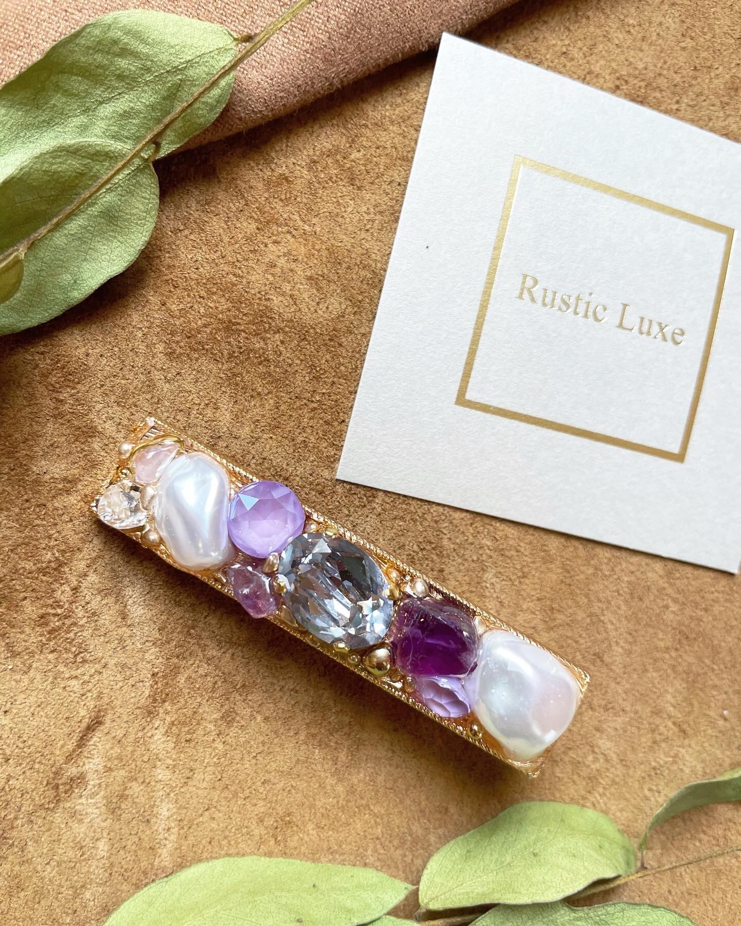 スワロフスキーや天然石、バロックパールなどをふんだんに使ったビジューヘアピンです。