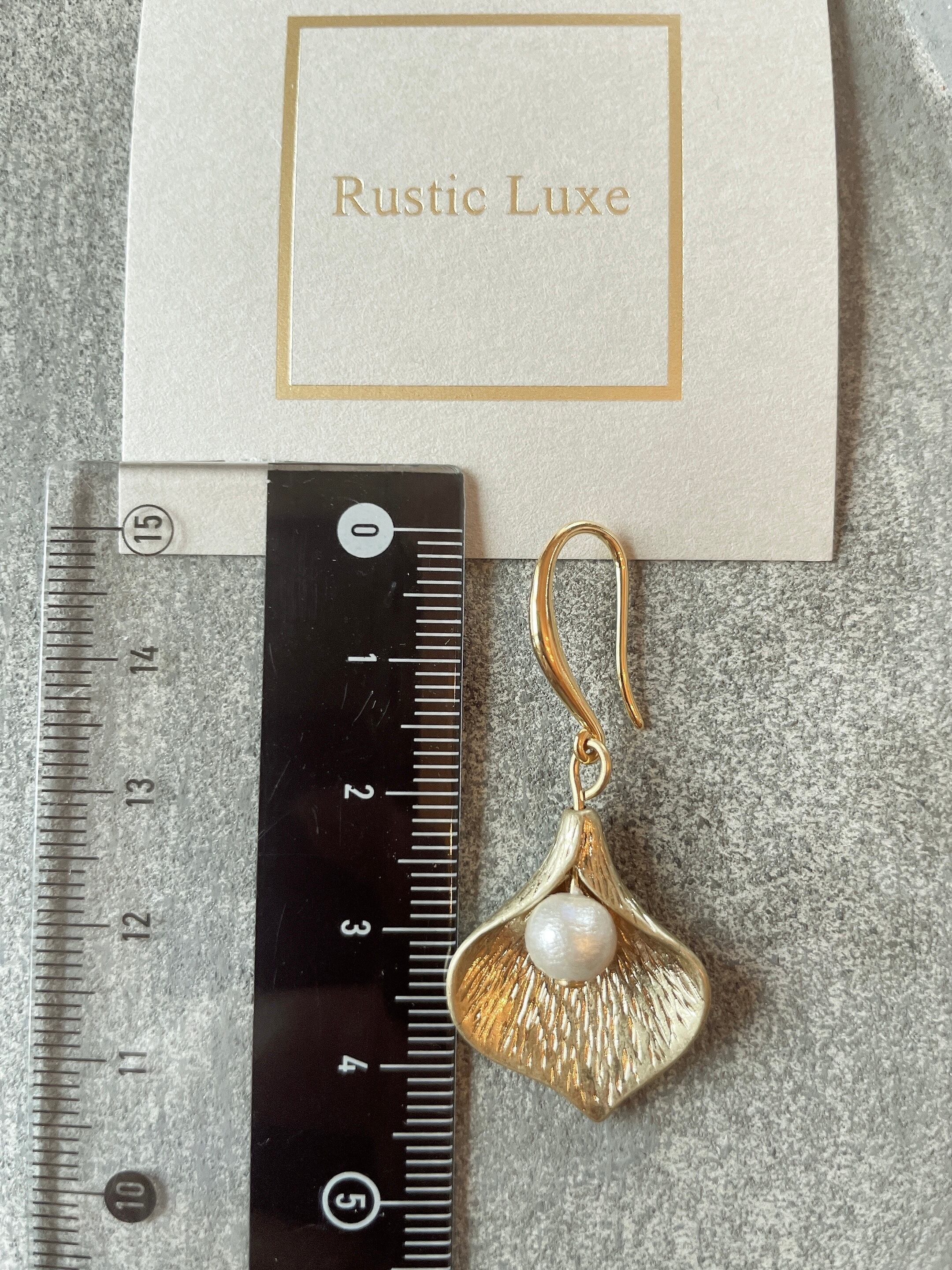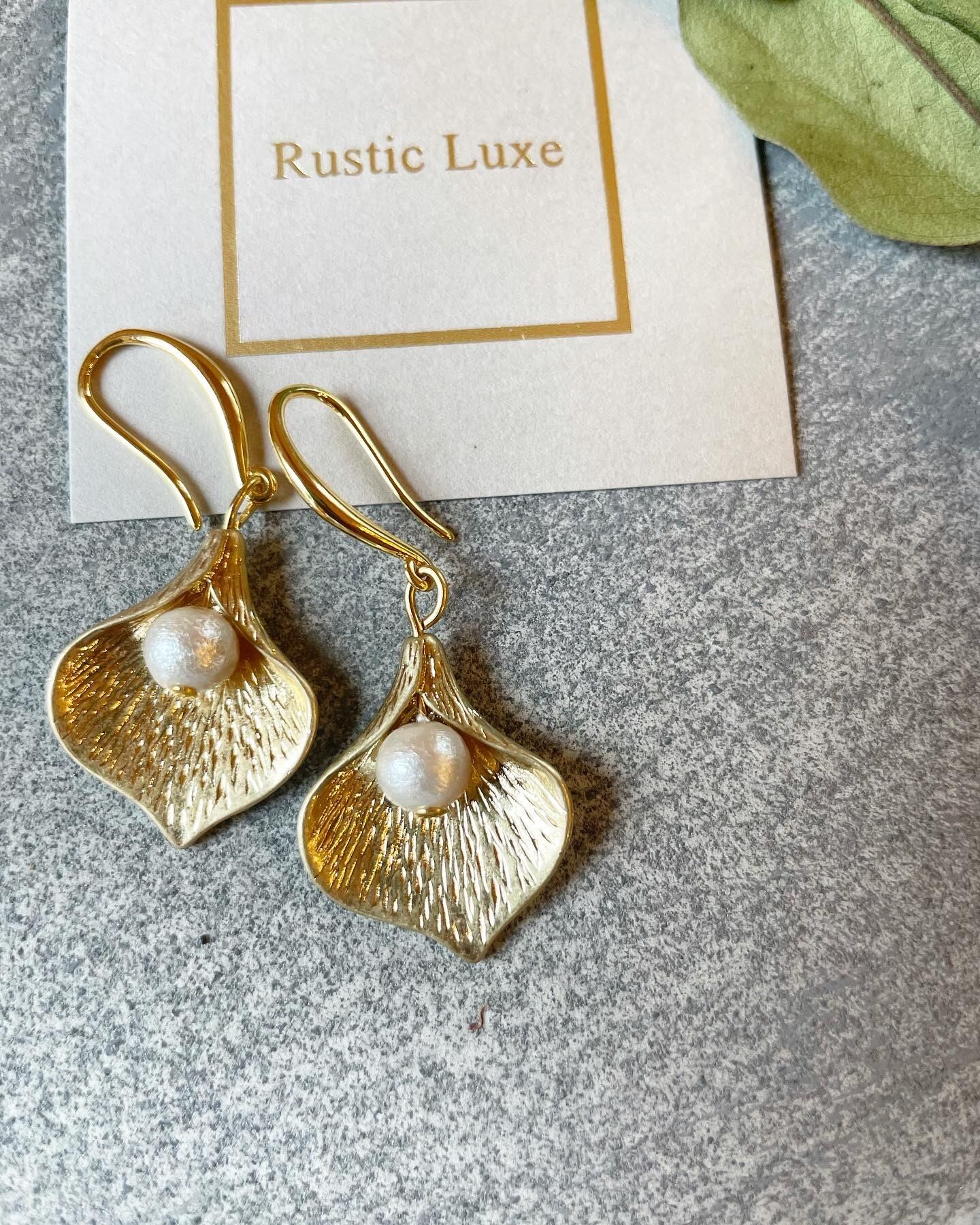 ぶら下がるタイプのゴールドの花びらとパールの上品なピアスです♡
