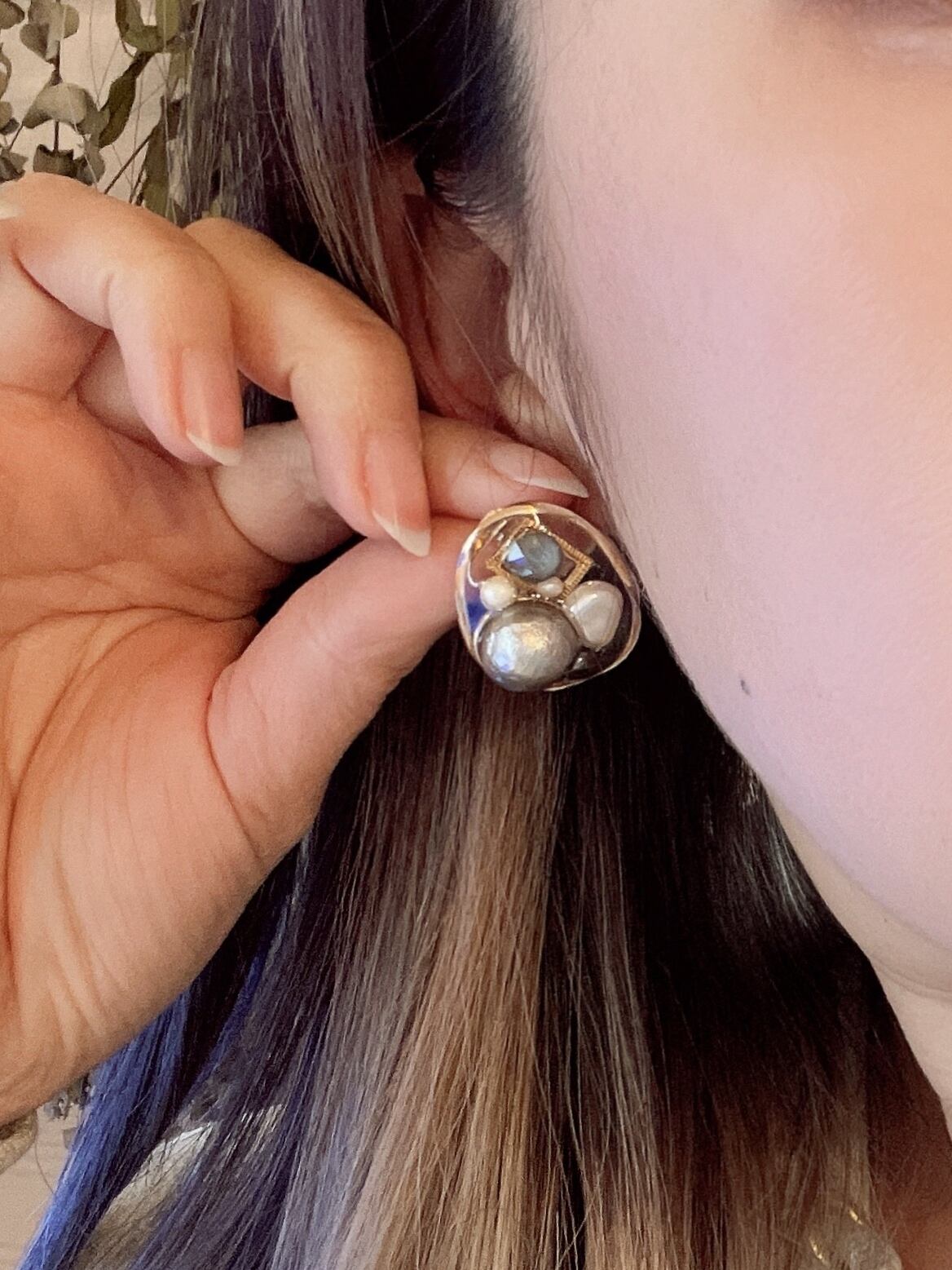 レジンでグレー系のパールやスワロフスキーを埋め込んだ華やかなピアスです。