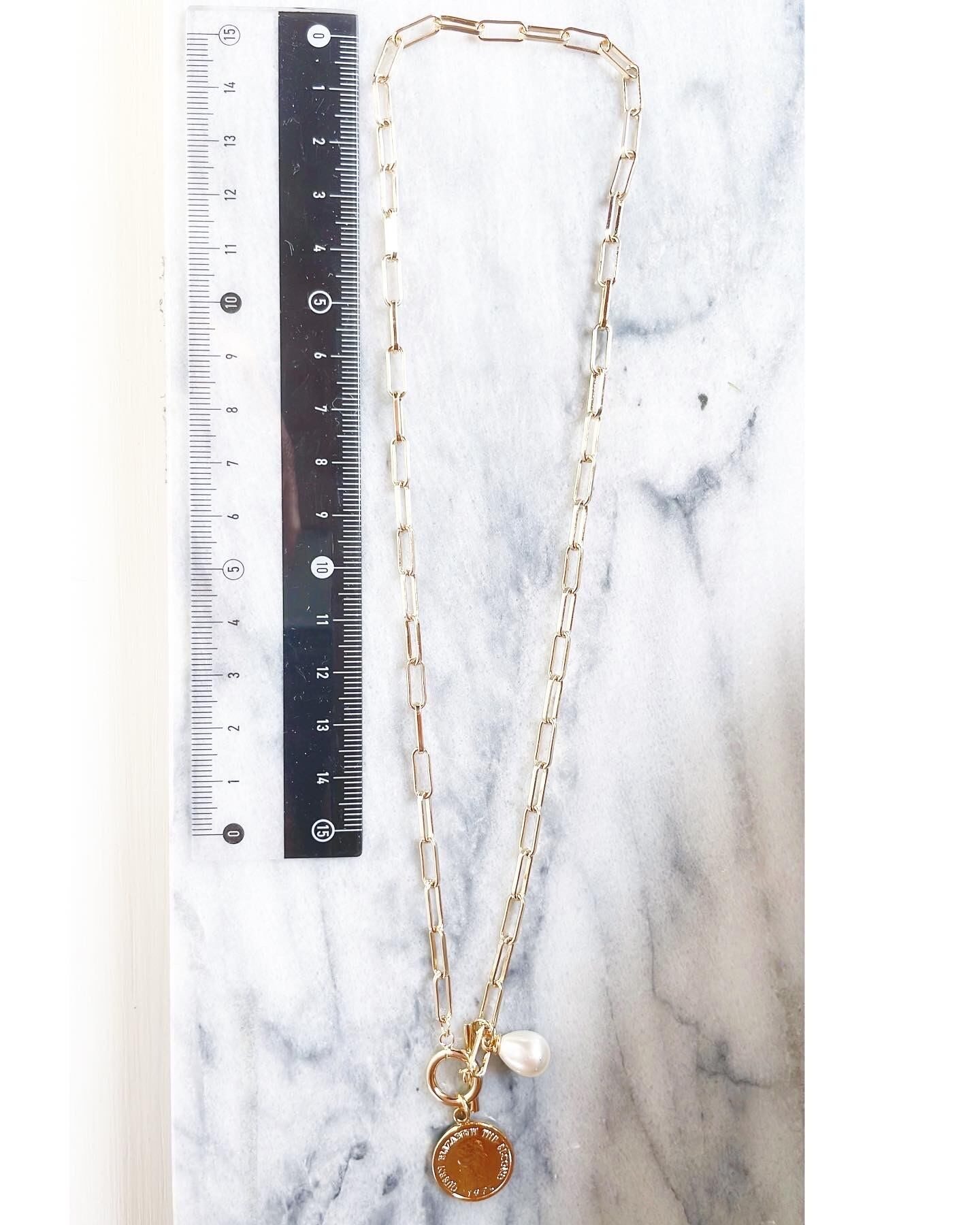 マンテルチェーンで、着脱ラクラクなネックレスです。パールとコインのチャーム付きです。