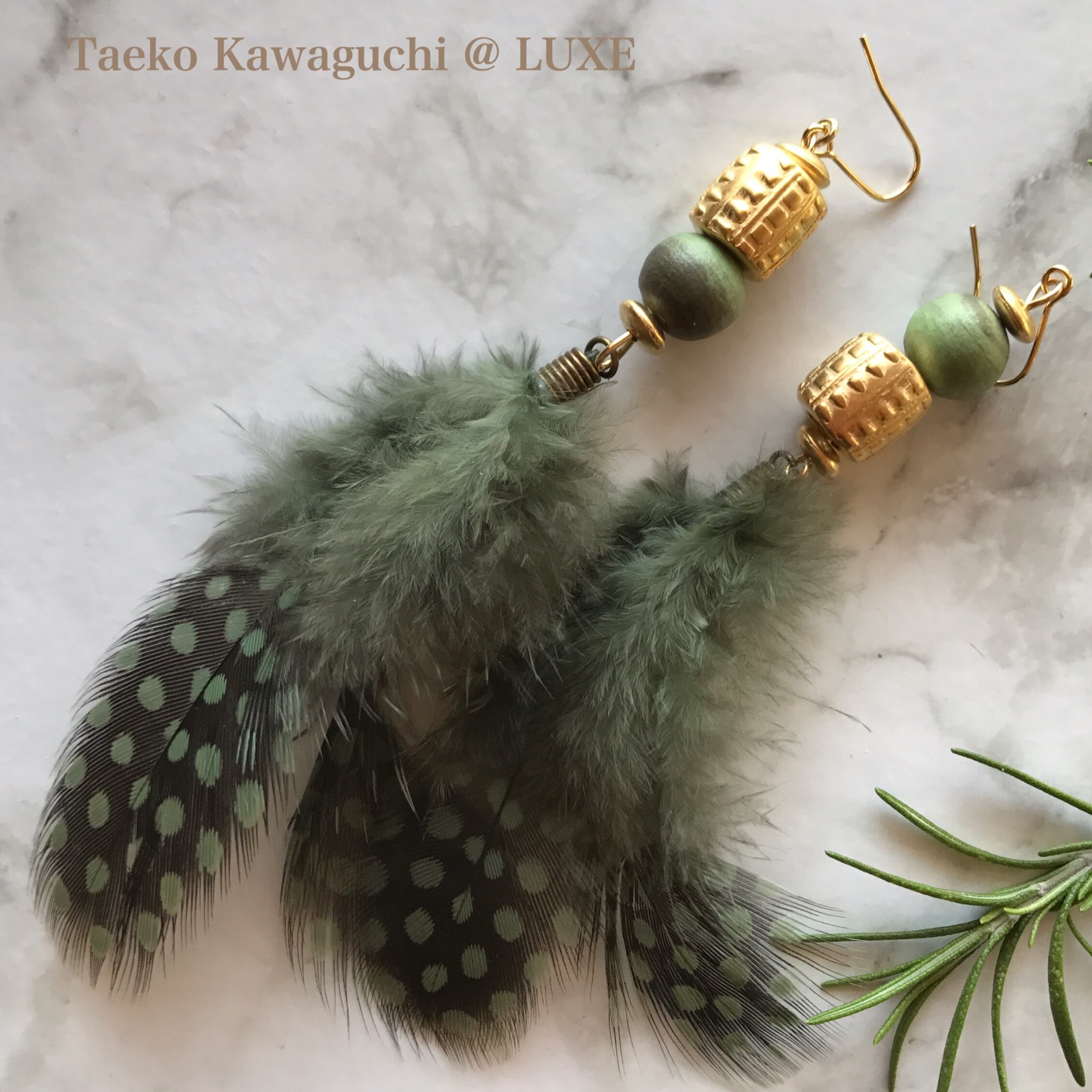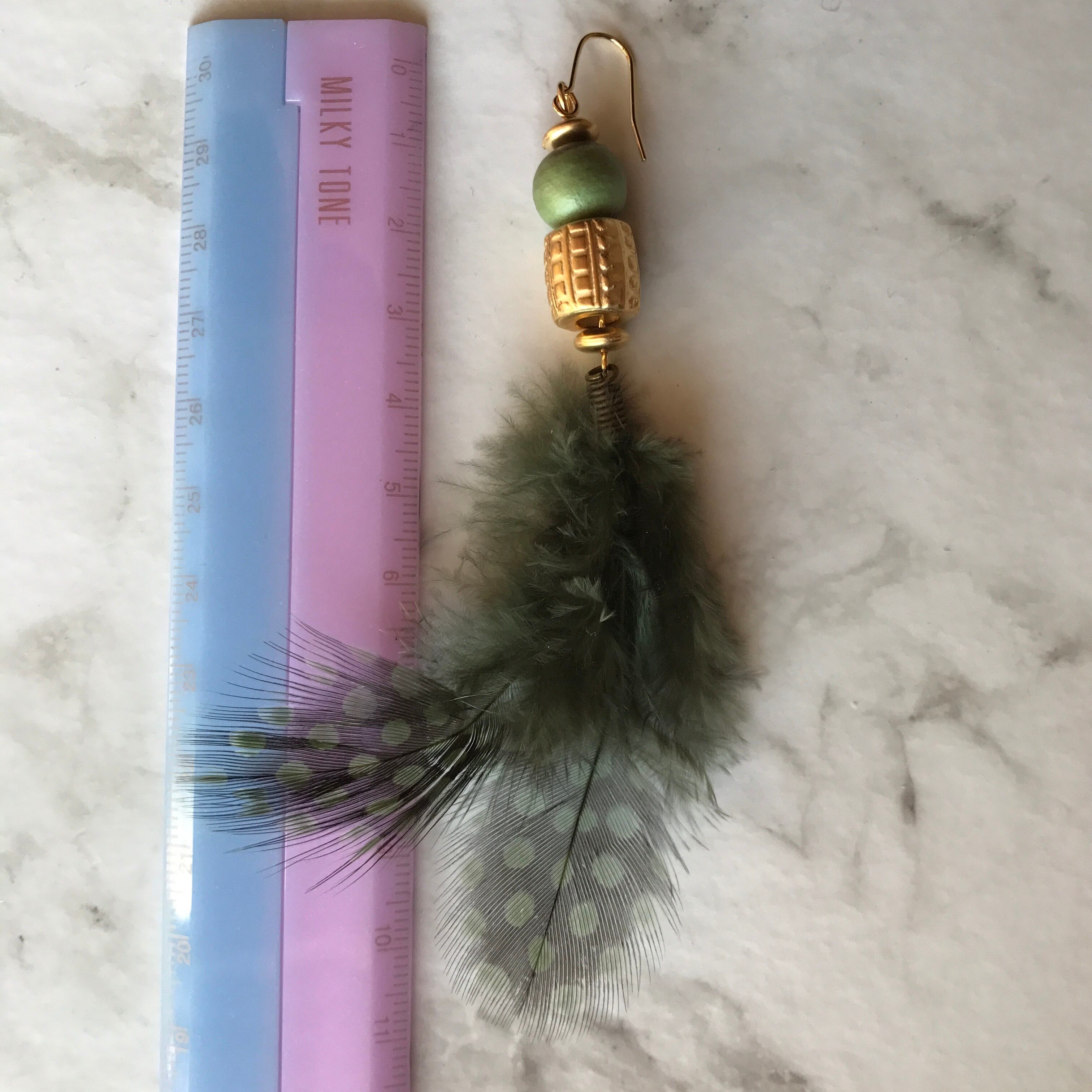 グリーンのフェザーとグリーンのコットンパール、ゴールドパーツのロングピアス。