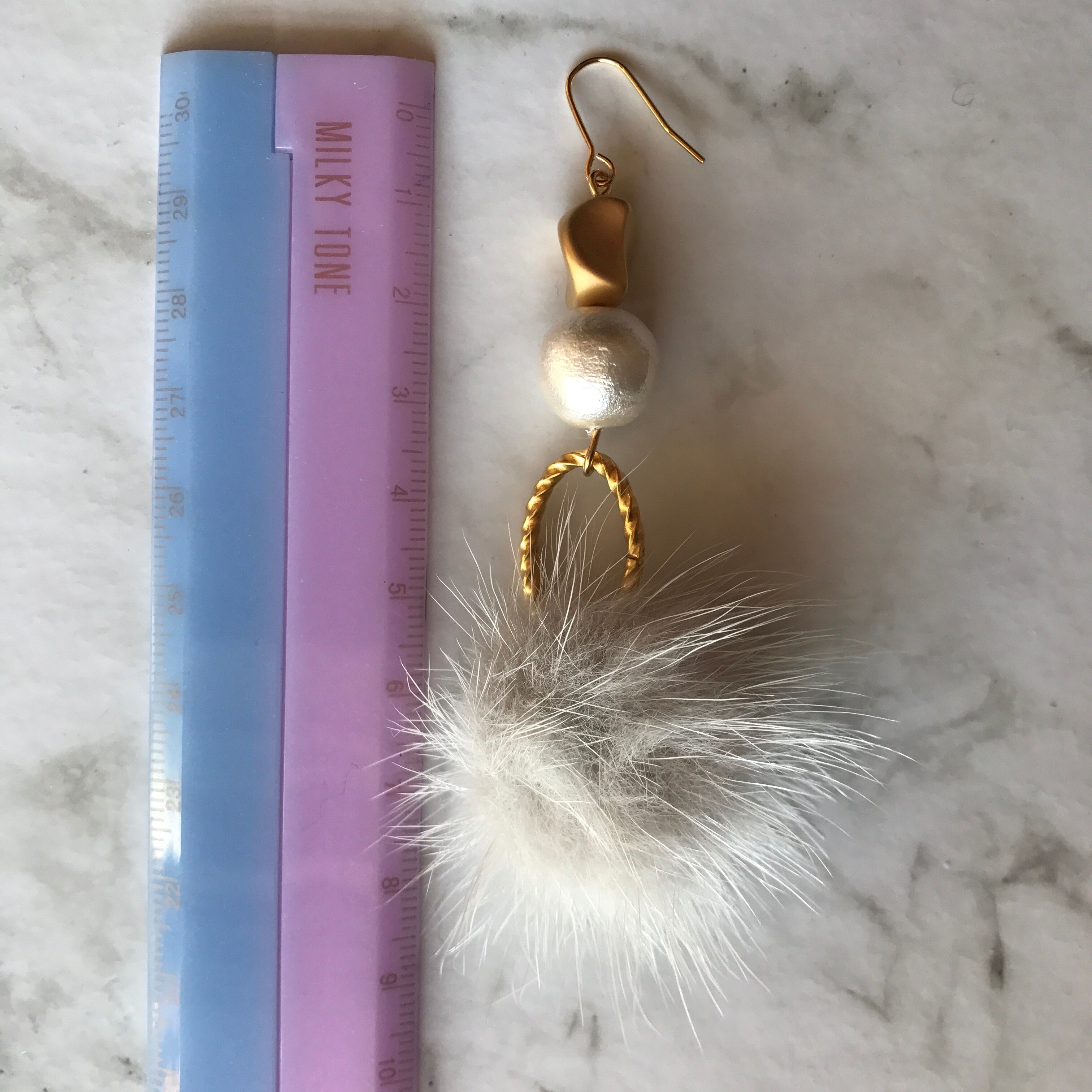オフホワイト(少しグレーがかったホワイトです)のファーとゴールドパーツで大人カッコいい雰囲気です。