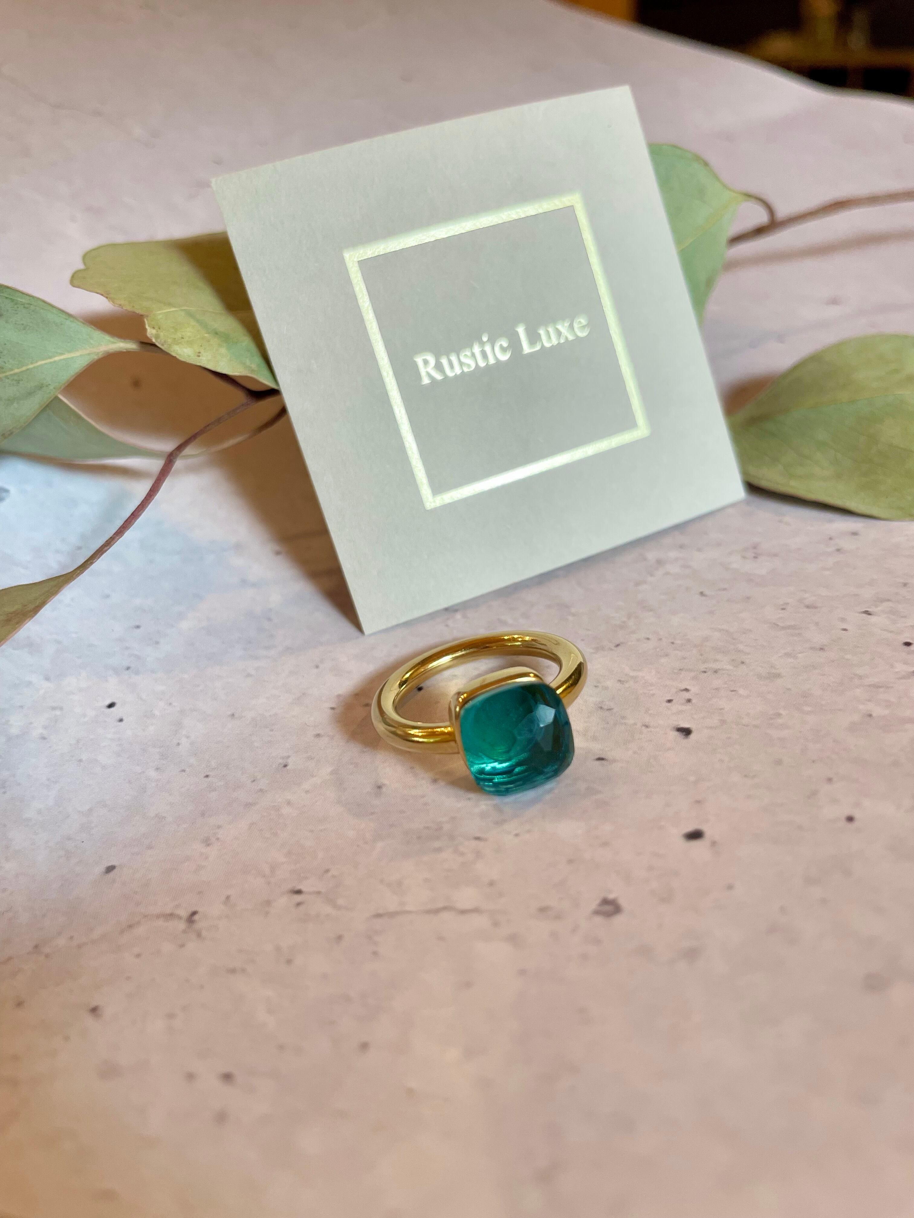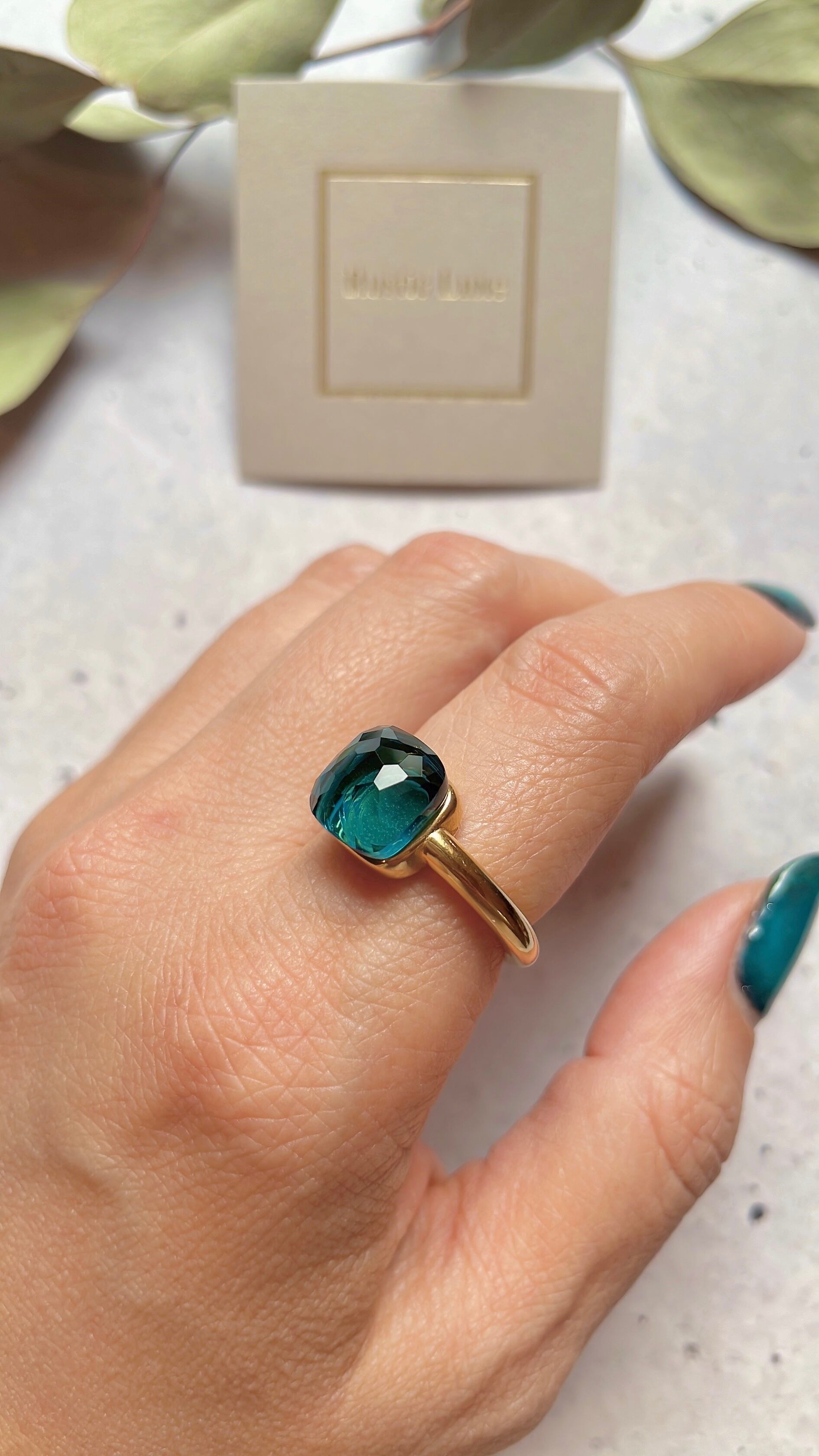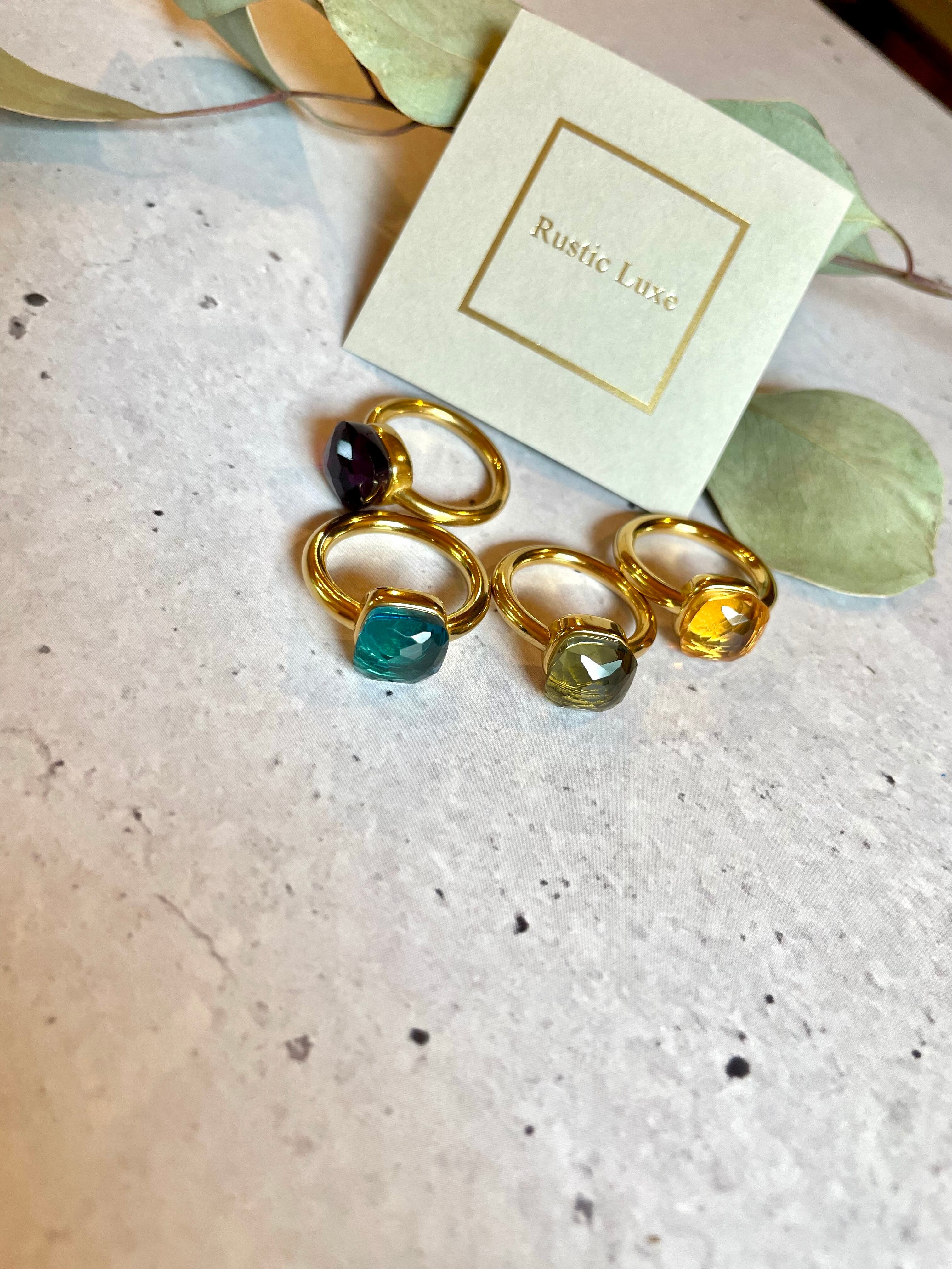 大粒ビジューがアクセントのカラーストーンリング。存在感のある輝きで、ふっくらとした立体的なシルエットが目を引くデザインです。