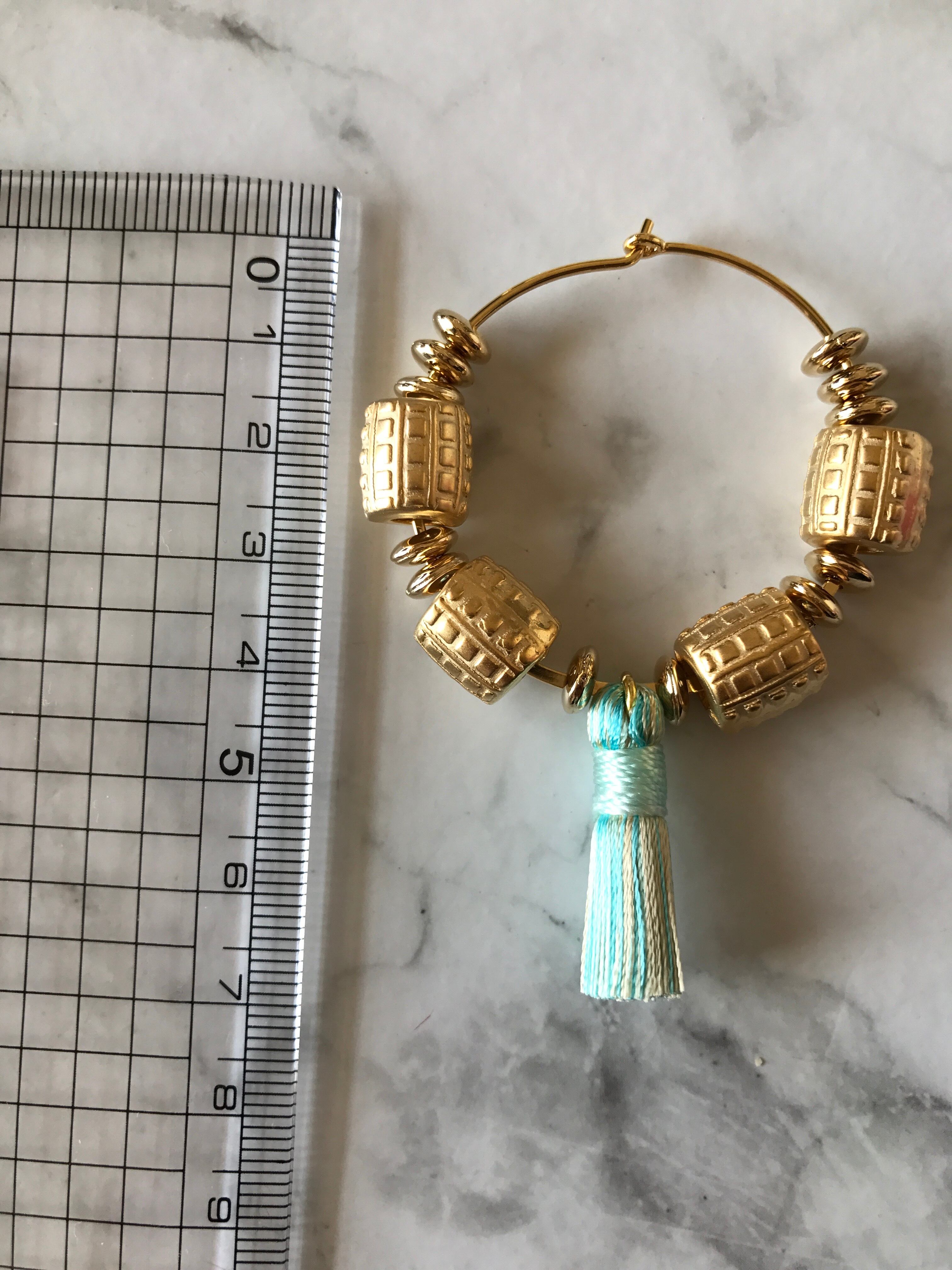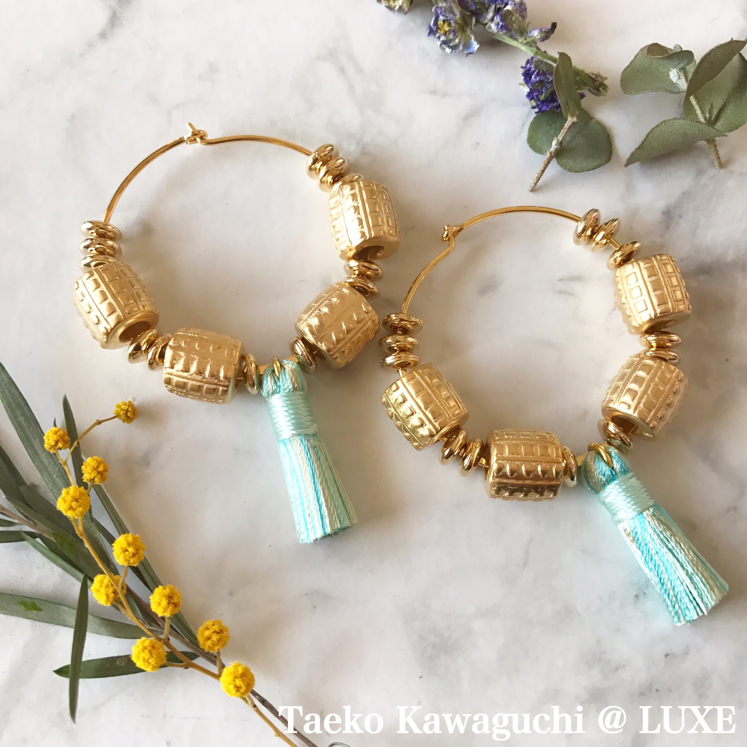 ゴールドの大きめフープピアスに、ミントグリーンのフリンジで、高級感もあり春らしくもあるピアスになりました。